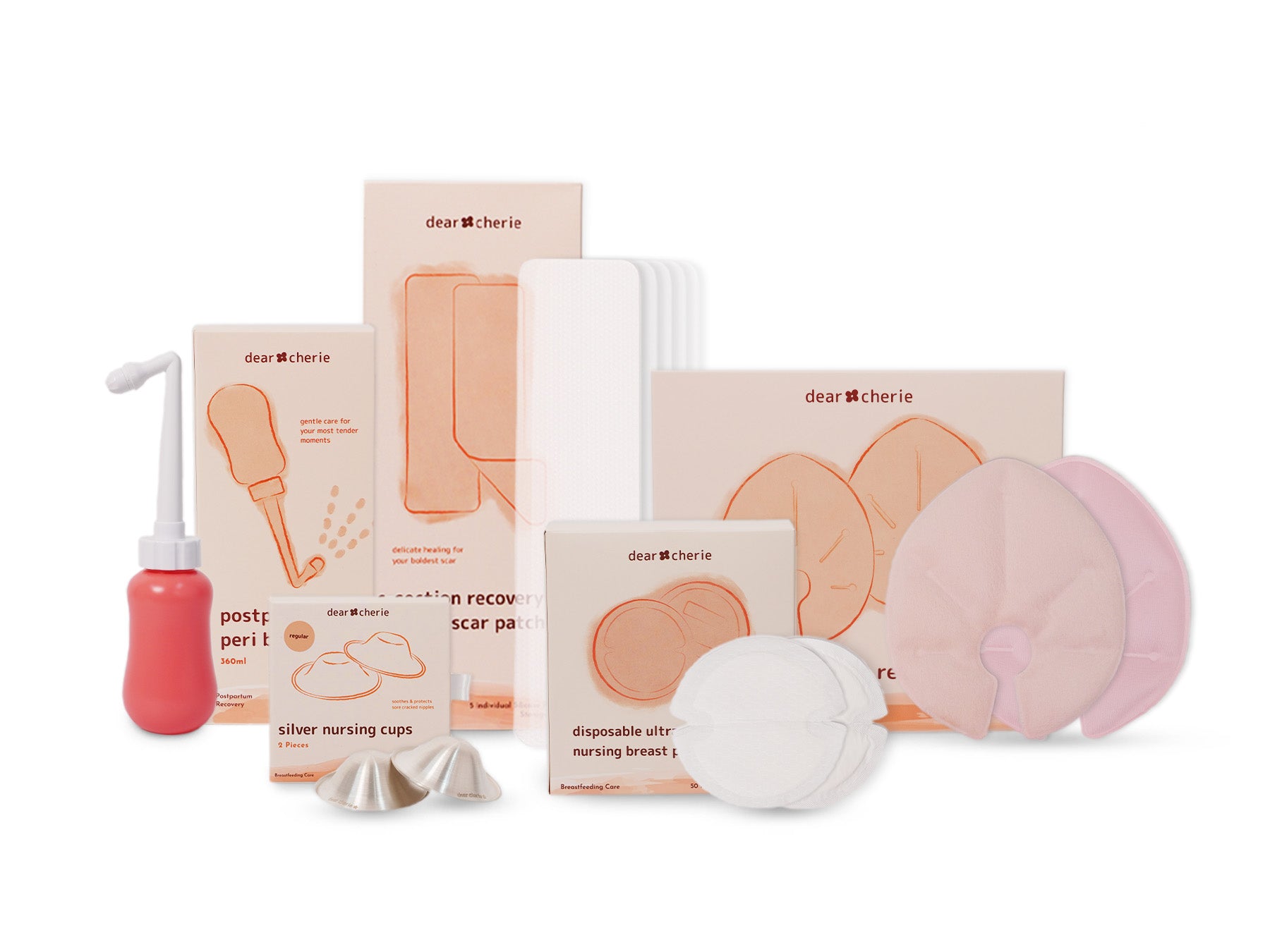 Inside, you’ll find essentials chosen to support incision recovery while easing the everyday discomforts that accompanies it. From silicone scar patches that cushion and protect healing skin, to a gentle rinse that helps you care for your body without bending or strain, to breast care that supports engorgement, leaks, and tenderness, each piece plays a quiet yet essential role in helping you feel more supported as your body regains strength.